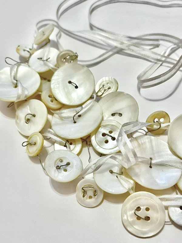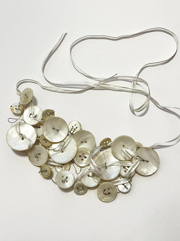 Collar realizado a partir de hilo de alpaca, cinta de organza y botones de nácar de diferentes colecciones.