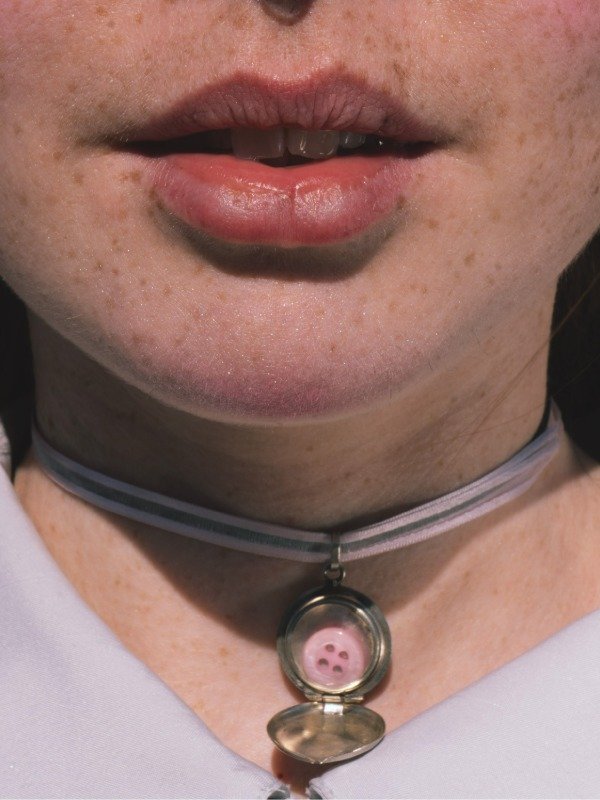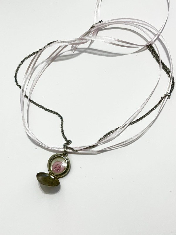 Relicario vintage recuperado y pulido con corazón de botón color rosa.
