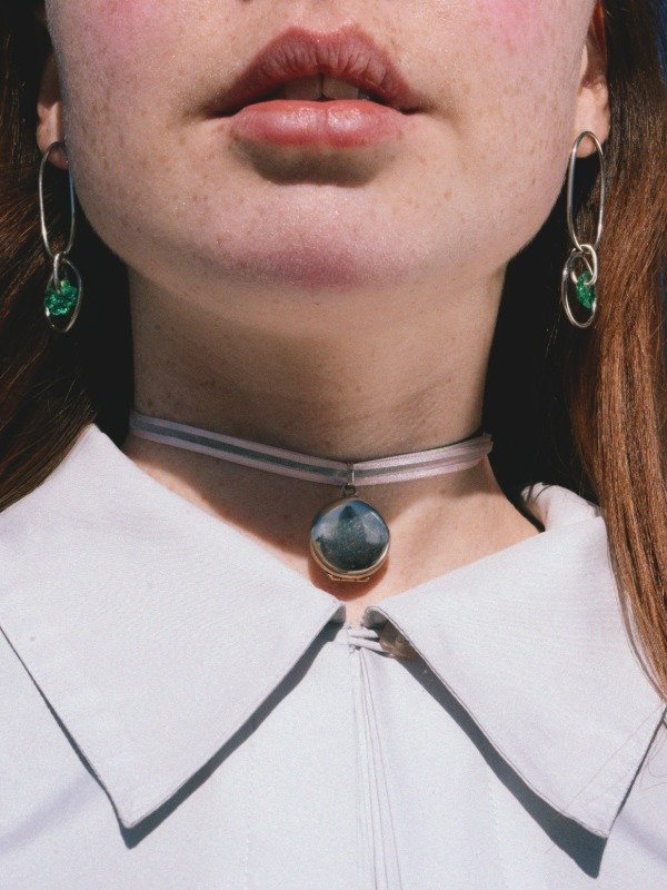 Con cadenita de acero inoxidable + cinta de organza color rosa. Se puede ajustar a diferentes alturas.