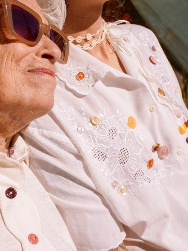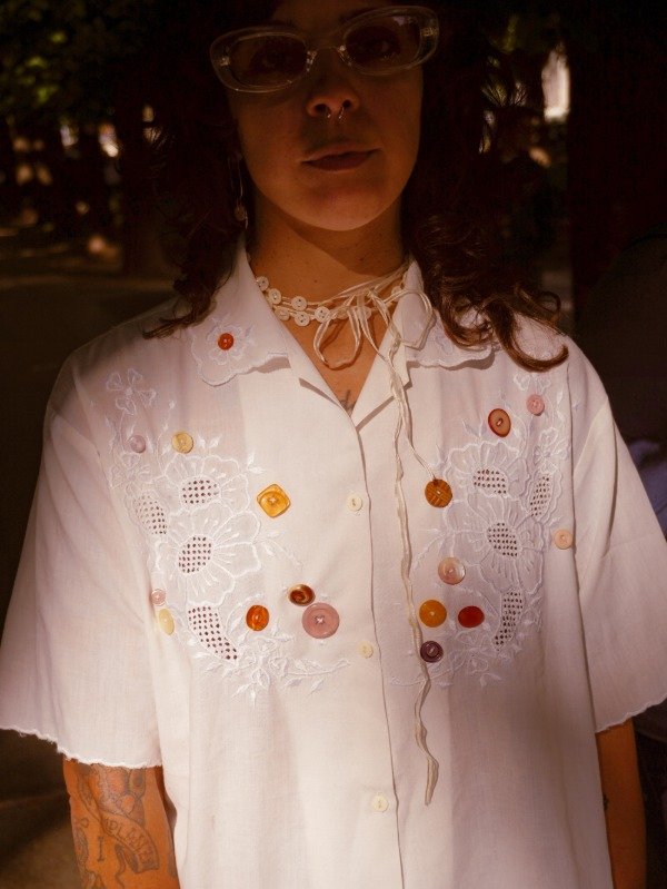 Camisa vintage bordada intervenida con botones cosidos a mano de diferentes colecciones.